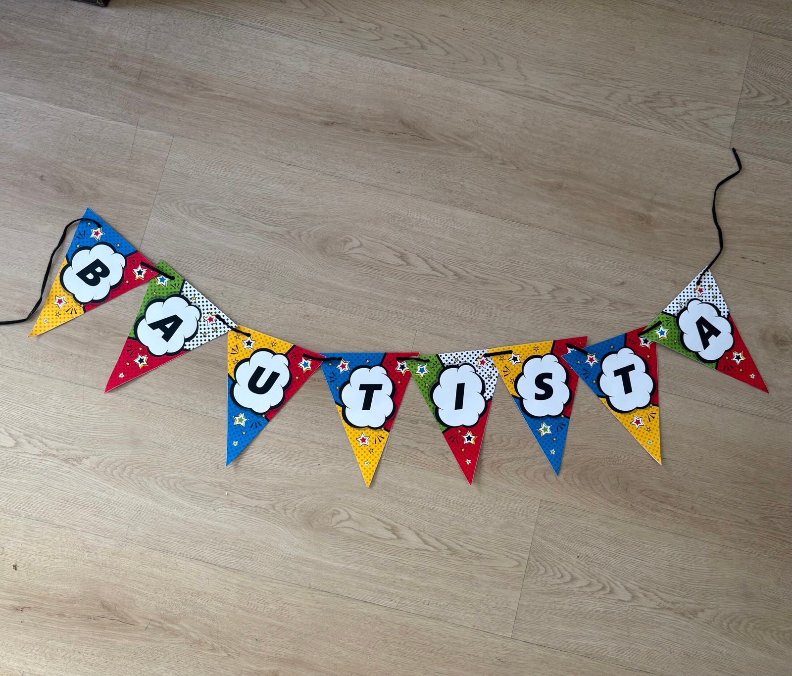 Banderín básico triangular. Puede tener el nombre del cumpleañero/a o decir “Feliz Cumple”