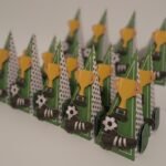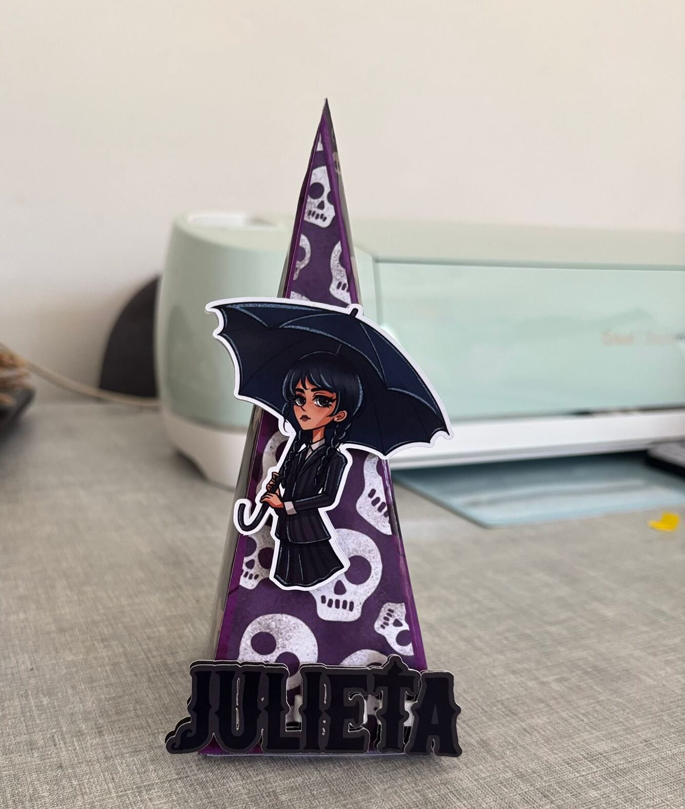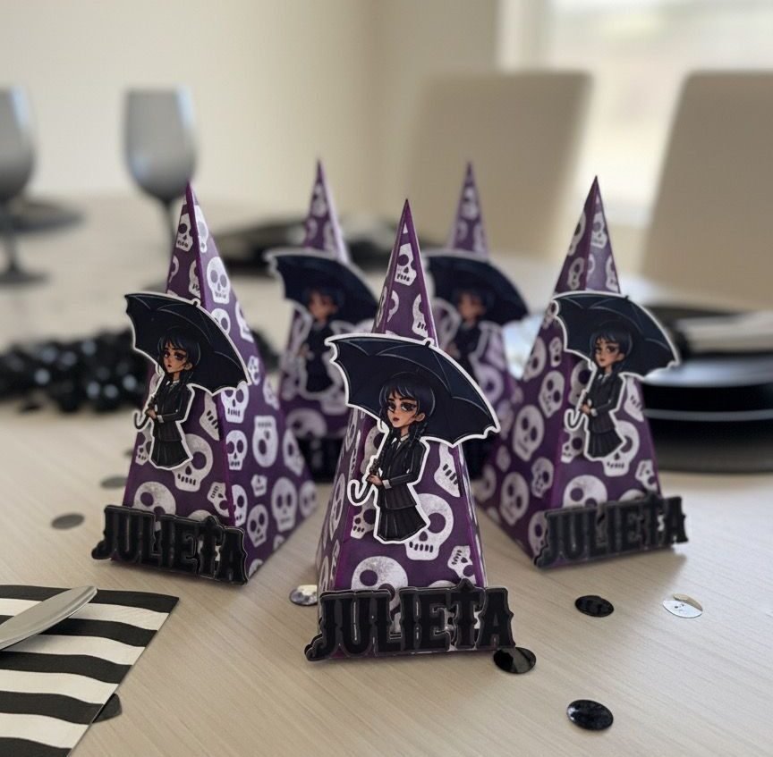 Cajita con forma de cono, lleva dos apliques en 3D. Puede ser en material brillante u opaco.