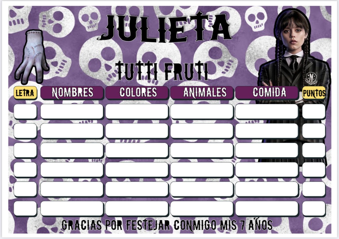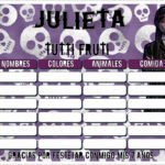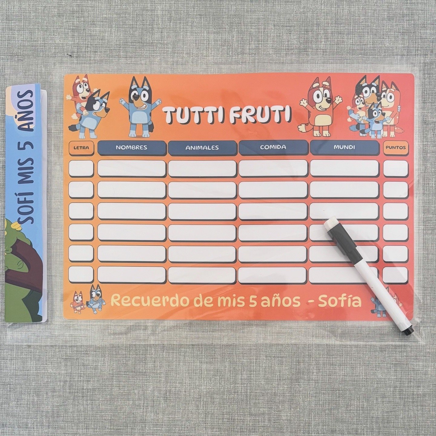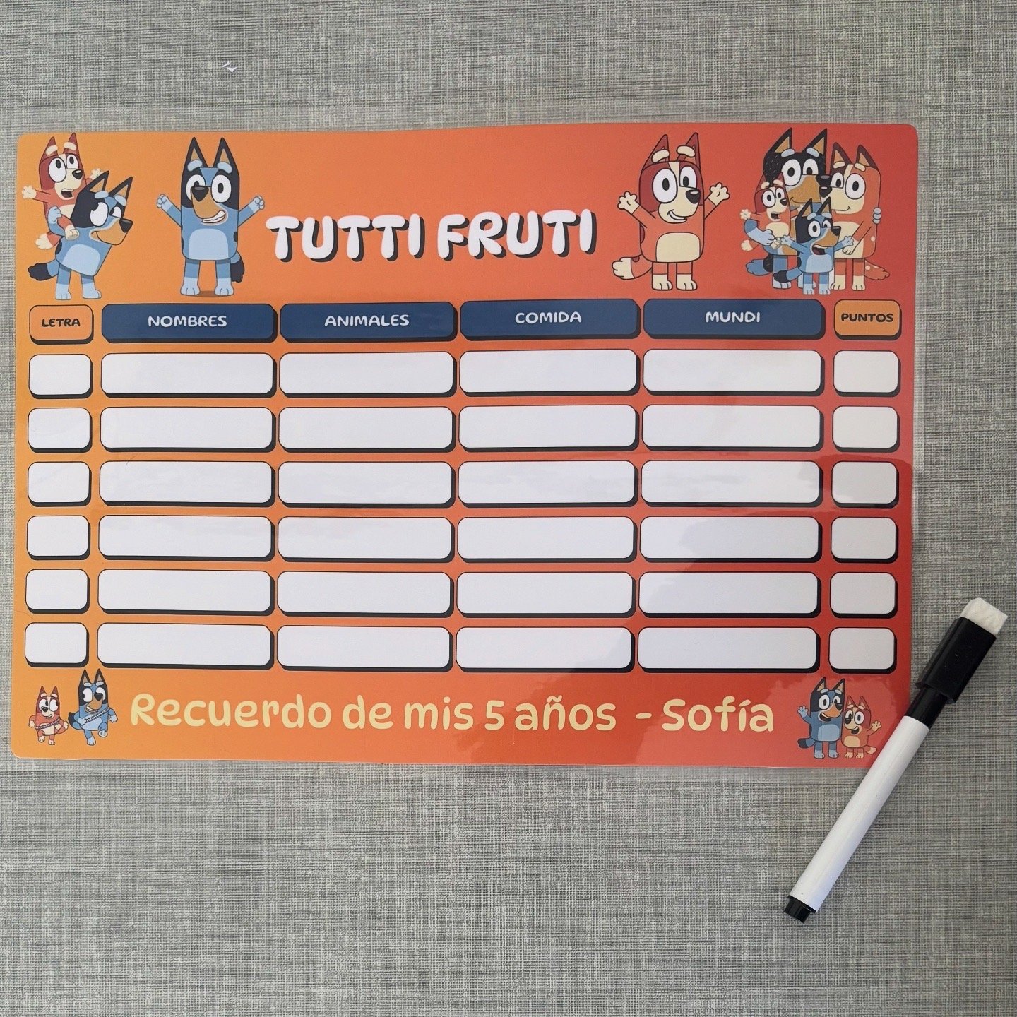 Tutti fruti plastificado tamaño A4, con marcador de pizarra para jugar, borrar y volver a jugar.